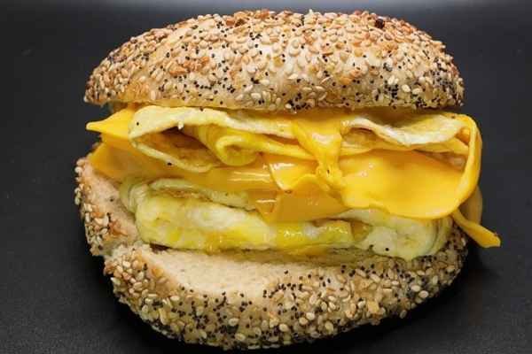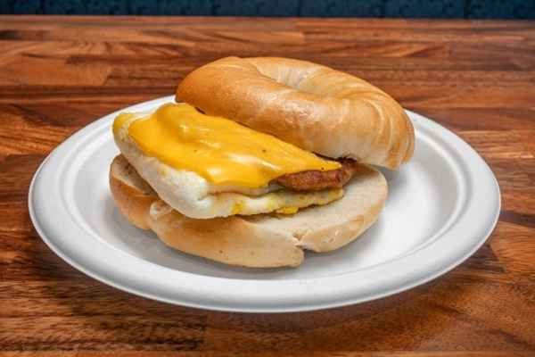 A satisfying bagel sandwich featuring crispy slices of sausage…