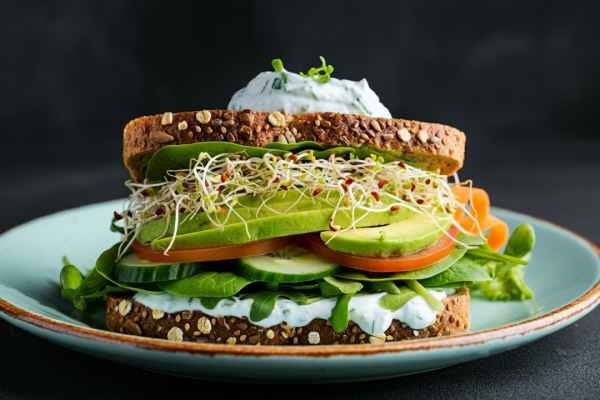 Avocado, lettuce, tomato, onion, alfalfa sprout, pepper, oil and vinegar.